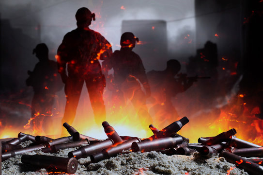 Automatic rifle gun shells laying on sand with fire and soldiers.