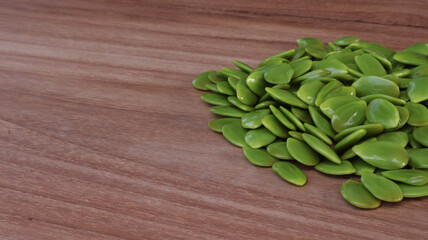 Petai cina or Leucaena leucocephala seeds on wooden surface with copy space