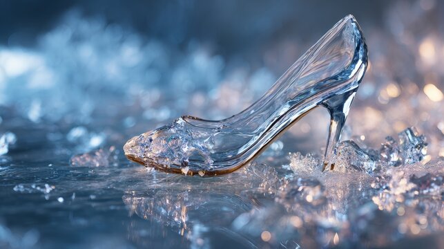 Elegant glass shoe on ice with glowing reflections in a frozen fantasy setting