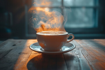 A cinemagraph of a steaming cup of coffee, with the steam moving while the rest of the image is still. Concept of subtle motion in everyday moments. Generative Ai.