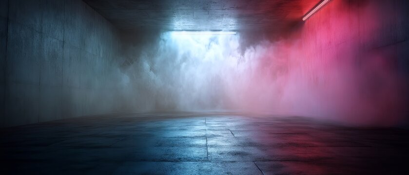 Empty industrial room transformed into futuristic neon-lit street scene, cinematic smoke and fog drifting across wet asphalt concrete floor — dramatic urban background for product display