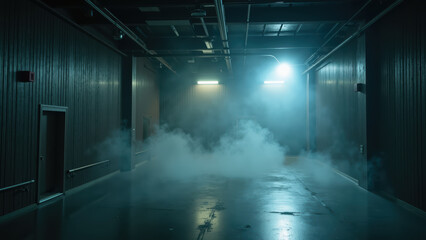 Mysterious cloud of blue smoke rises in a narrow, modern architectural corridor at dusk, illuminated by ambient lights, evoking surreal atmosphere and artistic visual tension