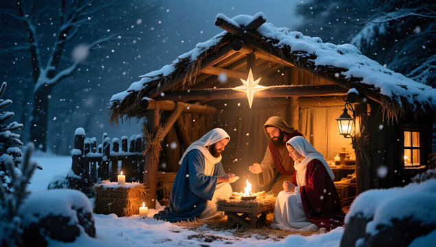 A cinematic shot of snow falling around a lit nativity scene