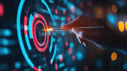 A hand holding a stylus points to a glowing circle on a digital screen. The screen is filled with data and charts.