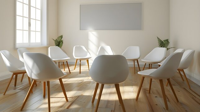 The sunlit room features an empty circle of chairs, inviting a serene setting for conversation and meetings