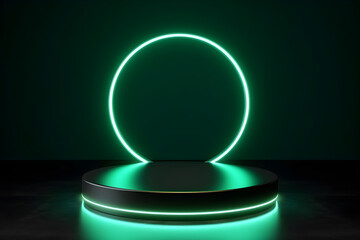 Modern empty green podium pedestal with neon glowing green circle light on stage for product blank display podium scene or presentation with showcase in the studio room background.