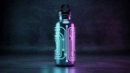 Metallic water bottle featuring glowing neon blue and purple circuit board lines on a dark urban background futuristic technology and digital fitness concept
