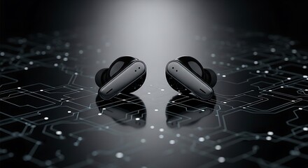 Dark sunglasses reflecting digital code on lenses placed on a glowing circuit board surface representing technology and innovation in modern design aesthetics