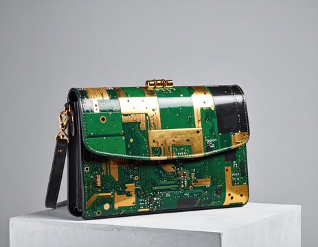 Tech-Inspired Handbag: A modern handbag with a unique circuit board design is showcased, blending technology and fashion into a stylish accessory, showcasing the future of design.