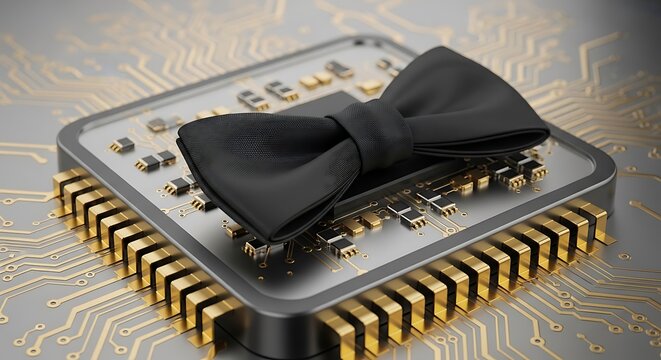 future  saint patrick's day Bow tie resting on a green circuit board background.