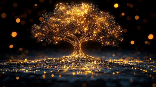 digital golden tree resembling a circuit board, symbolizing technology and nature's interconnectedness, set against an empty blank background, evoking a sense of innovation and potential