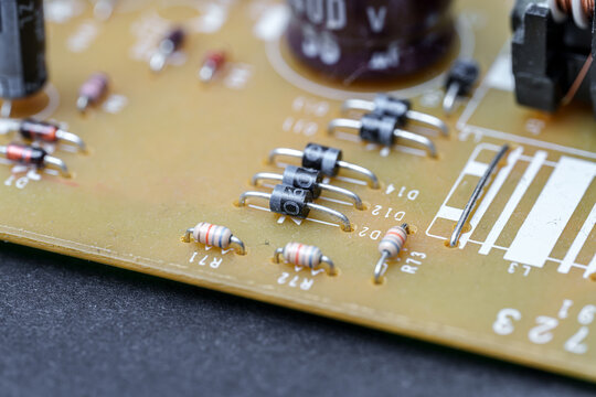 Electronic circuit board with various components like resistors and diodes displays intricate electrical pathways
