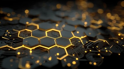 A complex, honeycomb-like structure with glowing, golden elements on a dark, metallic background. The structure appears to be a circuit board or a similar technological design.