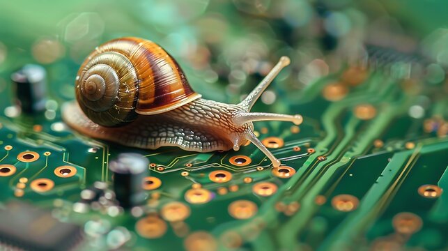 A snail on a green circuit board part of a computer hard drive controller board the circuit board is populated with electronic components like capacitors resistors a cpu and solder points