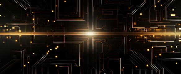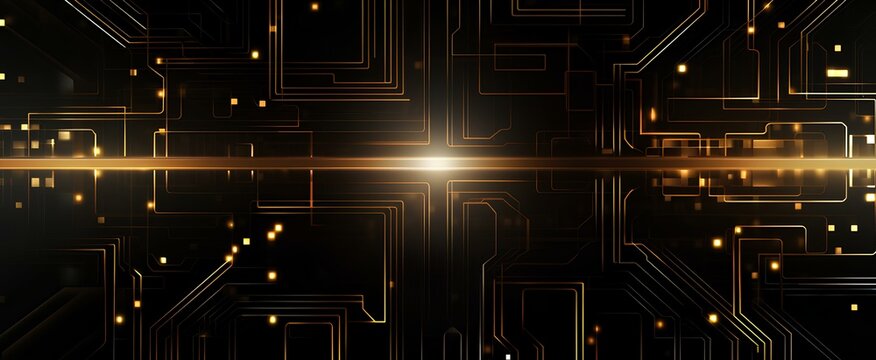 yellow light on a black backdrop, tech elements like a circuit board in the style of low poly video game art, vector illustration with lines and shapes, a dark purple and gold color scheme, 3d render