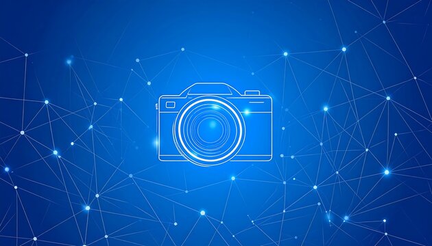 A digital illustration showing a camera outline with interconnected dots and lines, set against a vibrant blue backdrop