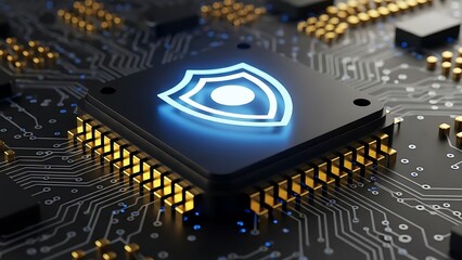 A glowing shield composed of circuit patterns symbolizing cybersecurity strength, system protection and the defense of sensitive digital information.