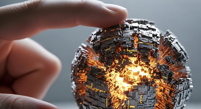 Cybernetic glow sphere interacting with advanced circuitry design.