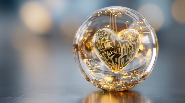 valentine future Digital heart inside a glass sphere with circuit patterns.