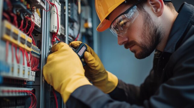Electrician testing circuit connections at a job site. Featuring safety and precision