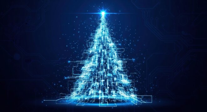 A blue, glowing, futuristic Christmas tree with a circuit board background.