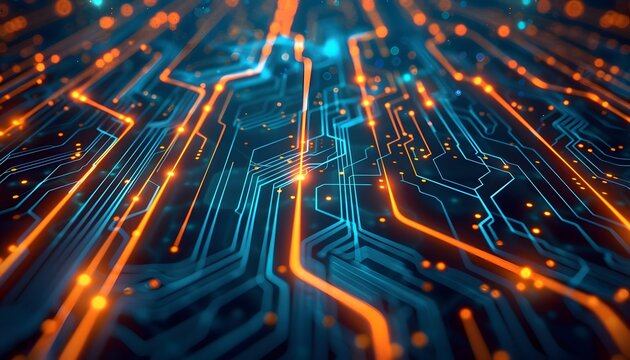 Futuristic glowing circuit traces in digital network