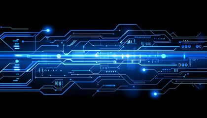 Abstract digital circuitry design with glowing blue elements on a dark background.