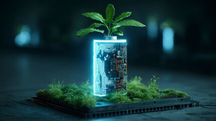 A vibrant artistic representation of a battery with a circuit-board design, sprouting plant life, symbolizing sustainability