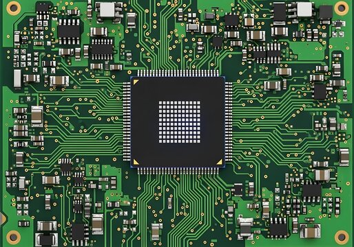 Closeup view of a green electronic circuit board with a central processor, showcasing intricate circuitry and technology
