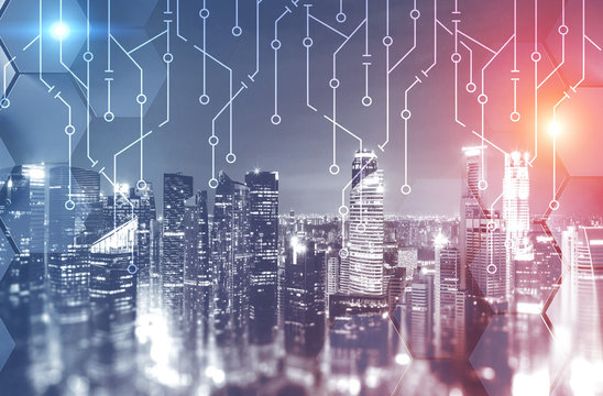 A glowing light bulb composed of circuits and lines, symbolizing technology and innovative ideas. Graphs appear faintly in the backdrop, suggesting data and progress.
