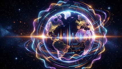 DNA strands orbit Earth, glowing circuits connect cities in cosmic digital realm.