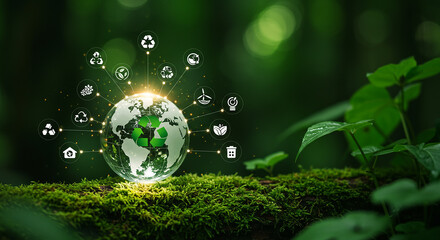 Circular economy symbol on icon Hands and big cities, endless circular economy in sustainable business ideas and future environmental growth.