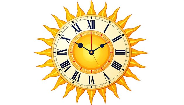 A golden clock, with a sunburst frame, displaying Roman numerals around the clock face and radiating sun rays