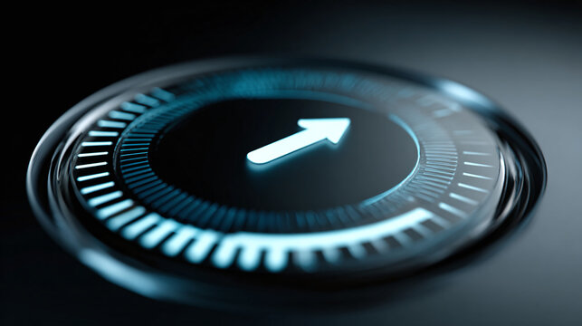 Illuminated directional arrow indicates movement or progress on a control dial in a dark setting. Shows precision, navigation, and advanced features.
