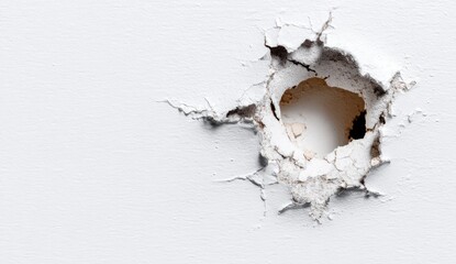 A circular hole pierced through a white wall, showing cracked and fragmented surrounding plaster