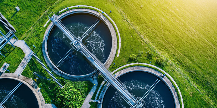 Aerial view of modern water treatment plant with circular tanks, highlighting sustainable practices and green surroundings. facility is designed for efficient water management