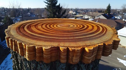 Close up drone shot of tree rings emphasizing circular symmetry of rings on a tree stump Captured with a high resolution camera and a macro lens to highlight the texture and fine details of the rings