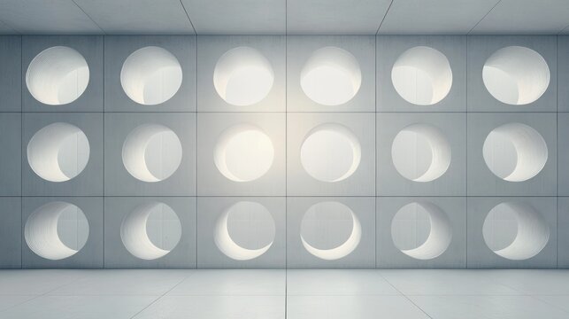 Minimalist concrete wall with a grid of circular indentations displaying varying light and shadow effects creating a calm, abstract visual atmosphere
