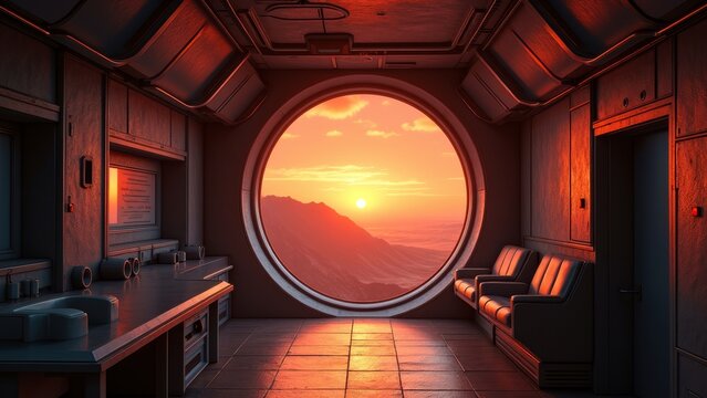 Gazing giant panda floating in spacecraft cabin, viewing earth through circular porthole