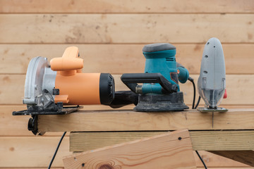 electric building tools for wood work on wooden wall background. circular saw, sander, jig saw
