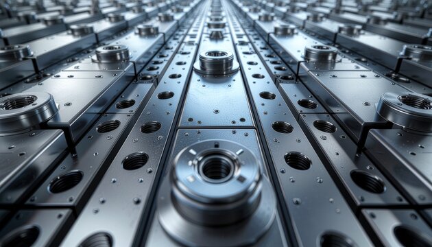 Close-up view of a precision-engineered metallic surface with repeating patterns of circular and rectangular components, suggesting industrial machinery or a manufacturing platform.