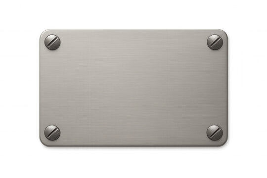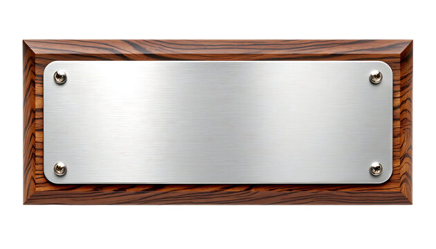 Blank brushed silver nameplate with rounded corners attached on walnut wood backing isolated on white background