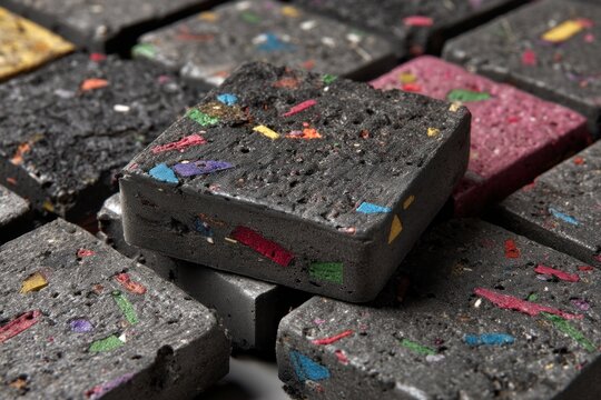 Recycled rubber flooring showing colorful particles embedded in dark material