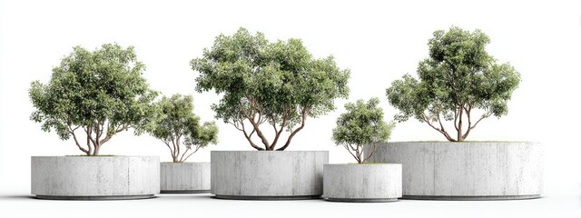 Blooming flowers in round stone planters as garden landscape elements for architecture and exterior design, featuring natural daylight and white background with copy space