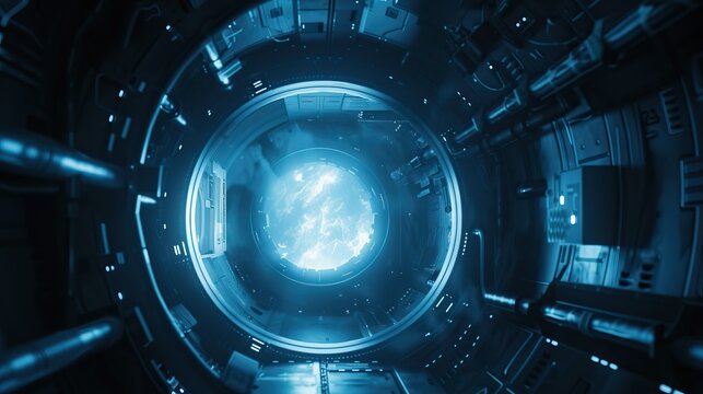 Futuristic spacecraft gliding through high-speed warp tunnel