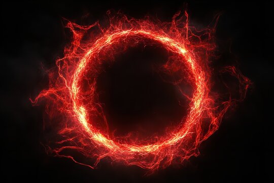 Red abstract circular plasma lightning particle effect with a swirling glow ring, featuring particle effects layered over an isolated black background.