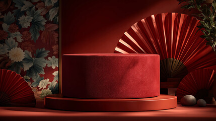 A deep red circular podium sits before a large neon heart outline with inner concentric heart shapes illuminated in pink and orange neon against a dark, textured concrete wall and a highly
