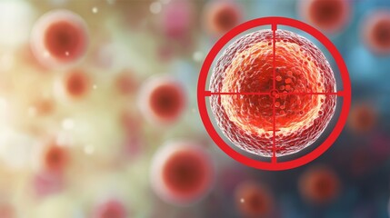 Targeted Cell: A close-up, abstract image showing a cell targeted by a red reticle, symbolizing medical, scientific, and technological advancements in fighting disease.