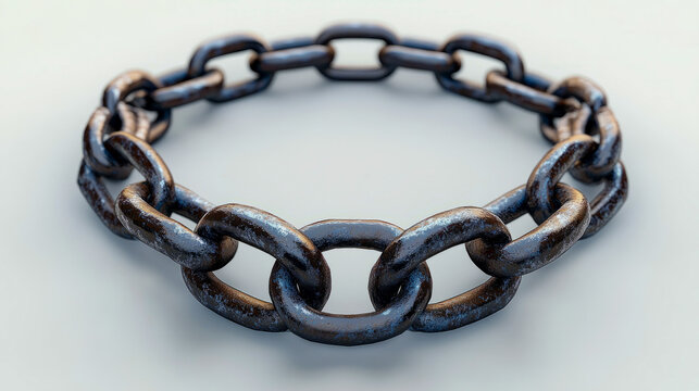 Close-up of a rusty metal chain link with a circular shape, displaying detailed textures and rust patterns against a smooth gray background.