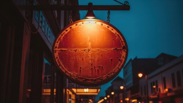 A rusty, round sign illuminated by a warm light hanging on a building at dusk